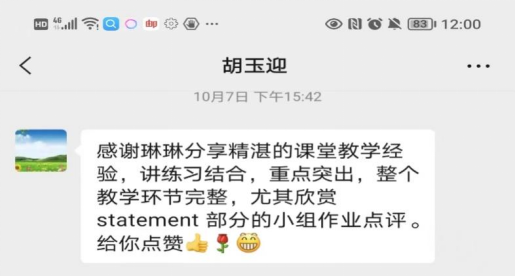 曹琳琳老师以《新时代大学学术英语》课程第一单元 introductory paragraph写作任务为授课内容,将篇章主旨作为重点,采用讲练结合的教学方式,所选材料与单元主题和知识点高度契合,师生互动充分,员工学习兴致高,小组活动积极性强。曹老师学术技能讲解细致,对员工习作给予积极反馈,肯定员工进步并指出不足,教学效果良好。课后,曹老师与线上线下观摩的教师就课程设计、授课方式、课堂活动、课后反馈等进行了深度探讨。