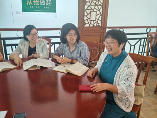 随后,编写组老师们各自汇报了《大学英语笔译教程》的编写进度和计划,共同交流编写经验。刘芳老师分享了自己的心得体会,并向编写组老师推荐了几本翻译经典教材。欣芳、秦勉、徐翠华、赵红辉等老师一起讨论了如何利用网络资源寻找合适的译例、哪些教科书可以作为参考、选材时如何避开敏感话题等等。