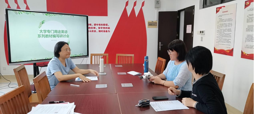 10月26日星期四下午,第二教学部和第五教学部大学专门用途英语系列教材编写组成员在大学城校区院系楼235办公室举行研讨活动。第五教学部主任孙红老师担任会议主持。