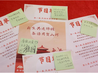 游戏环节“击鼓传花”中,主持人邀请现场幸运观众上台学习维语和客家话的“我爱你中国”,感受不同语言所蕴含的相同的爱国情怀。晚会最后,主持人邀请观众们写下对中华民族共同体的寄语,赞颂中华民族一家亲,同心共筑中国梦。