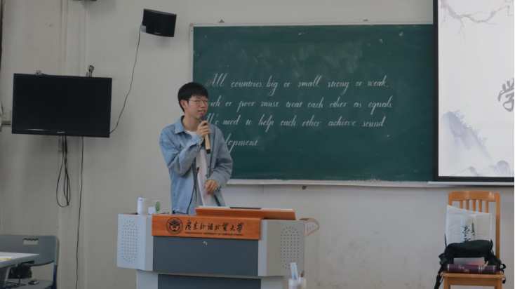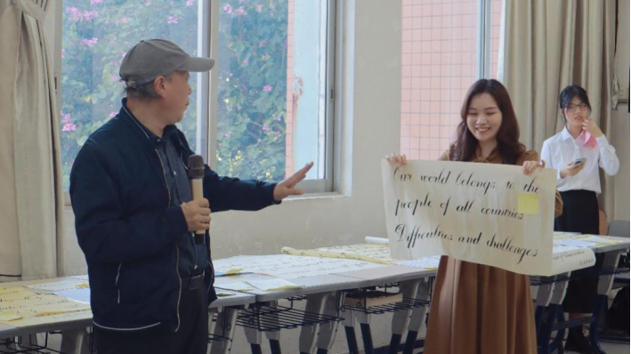 随后,孙章哲同学与萧晓颖同学分别进行了毛笔汉字书法展示与粉笔英文书法展示,分享练习书法初心与心得体会。两位同学的展示和分享引起了在场师生的强烈反响,他们不仅展现了对书法的热爱和才华,也向大家传递了书法艺术的独特魅力和价值。