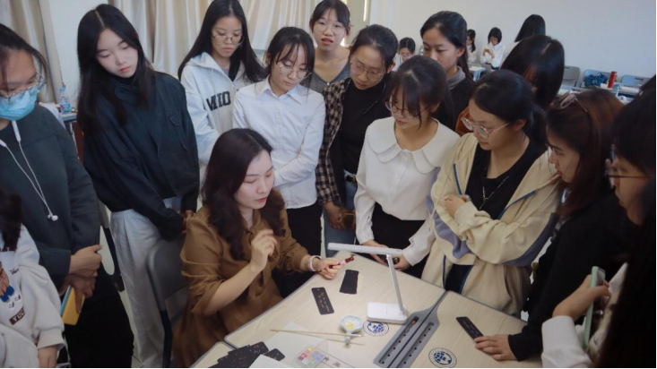 统计投票结果时,蔡寒松与唐亚琪现场展示并指导选手们毛笔与蘸水笔的书写方法、分享书法经验,勉励选手们夯实基础,锤炼教师专业技能。蔡寒松指出,毛笔书写有如“带着镣铐跳舞”,但同时书法不是“束法”而是“抒发”,书写者将个人的思想表达与传统书写规则统一,在有限的原则下去追求自由,才是书法执笔的目的。选手们纷纷起身,围绕书桌近距离观摩执笔方法与书写过程,全场反响热烈。