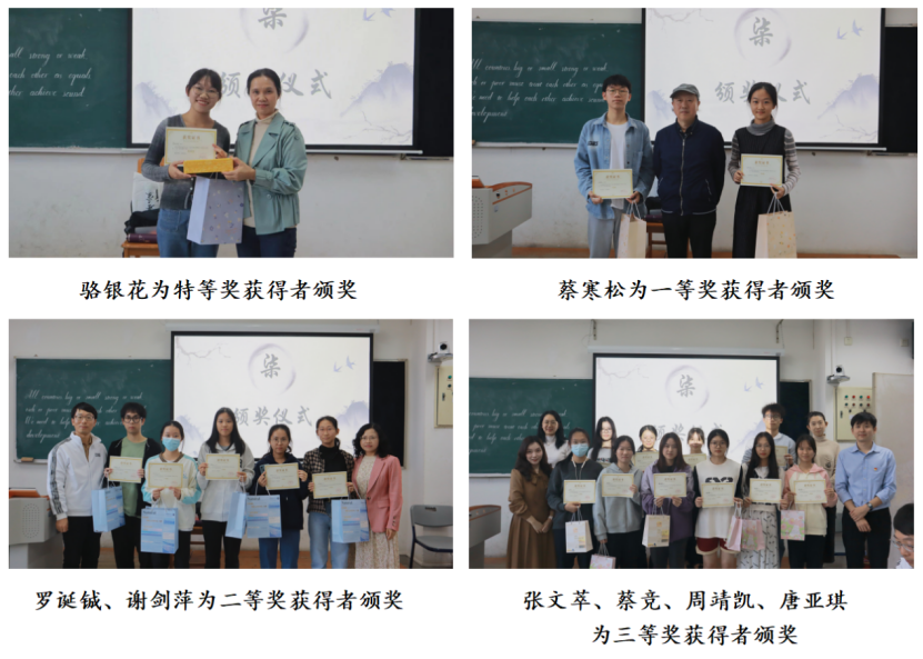 经过精彩角逐,本次比赛中萧晓颖同学(学号尾号908)荣获特等奖;孙章哲同学与林诗雅同学荣获一等奖;黄彤欣同学、黄宣瑜同学、张一清同学、柯翔茵同学与张智航同学荣获二等奖;凌烨同学、萧晓颖同学(学号尾号824)、林逸飞同学、陈炜婷同学、林幸儿同学、李佳璇同学、曾颖卓同学、廖嘉宜同学、石恩溪同学与简晶晶同学荣获三等奖。嘉宾们为以上选手颁奖。