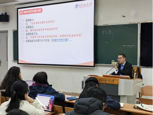 最后,王启介绍了近几年兴起的研究热点,例如续论、二语语用能力研究等。讲座结束后,吴岩经理高度评价了王启的讲座,并结合讲座的内容以及自己的亲身经历,鼓励同学们注重论文写作的规范性,在论文写作路上笔耕不辍,向王启老师看齐。