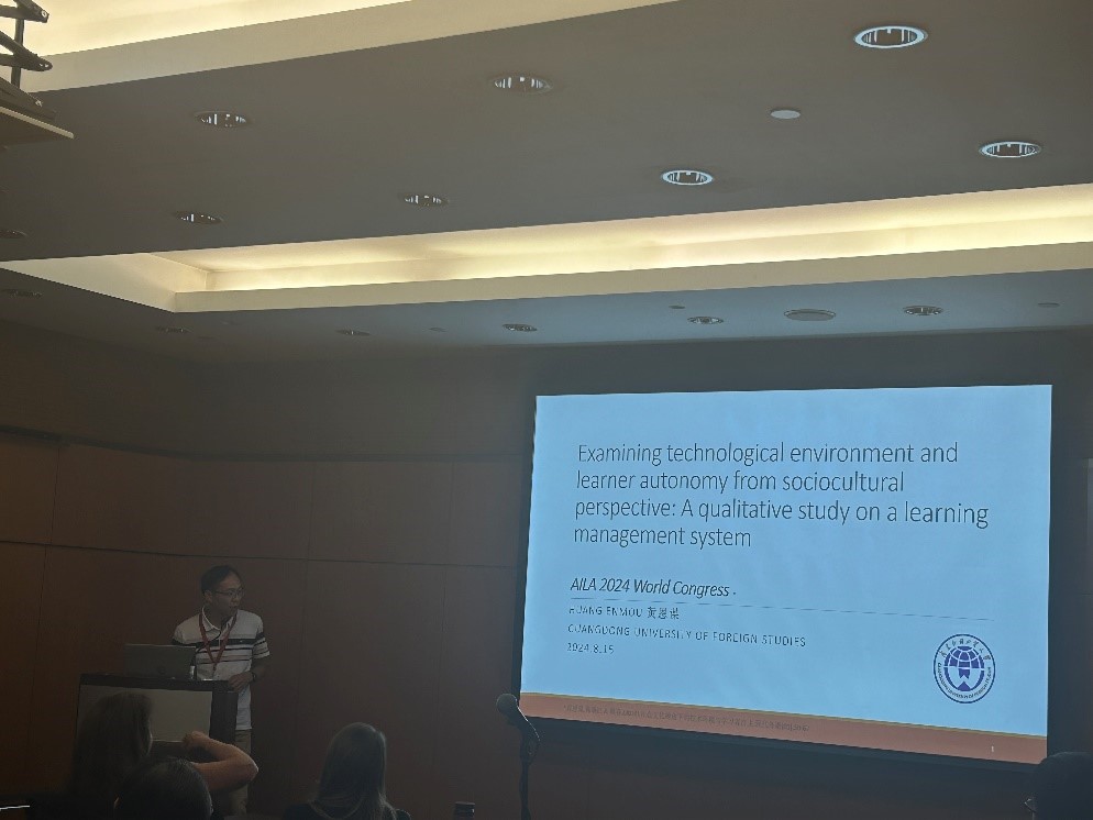 黄恩谋做了题为“Examining technological environment and learner autonomy from sociocultural perspective”的报告。本报告汇报了黄恩谋与合作作者们做的一个探讨非英语专业员工使用某课程管理系统过程中的自主学习行为及其影响因素的研究。他指出,尽管学习者表现出多维度的自主性,但是囿于工具性动机,这些自主体现为外显的、反应性的低层次自主。他明确,学习者自主存在于师生互动和人机互动的社会文化环境中,各影响因素达成协同效应方能促进自主。教师需设计合理的学习任务或项目,关注学习者个体特征,并营造社会化学习环境,才能更好地引导学习者往高层次自主发展。