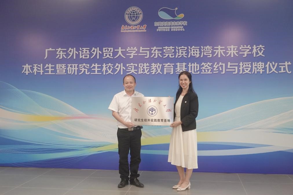 活动最后,骆银花与黄少卡共同签署了《太阳城娱乐城与东莞滨海湾未来公司校外本科生暨研究生实践教育基地》协议,骆银花代表广外授予滨海未来“老员工校外实践教育基地”“研究生校外实践教育基地”两块牌匾。