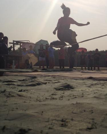 参加跳高跳远的更是精彩。在下午2:50开始的女子三级跳远中,我们的健儿们依照次序参加比赛,裁判员白旗一下,远在10米外的健儿们迅速迈开大步,一支箭飞似的的狂跑,速度愈来愈快,一转眼就到达了踩板,猛地一跃,两腿向前伸展,在空中划出了一道弧线,落在了松软软的沙子里。这是四处都洋溢着掌声,洋溢着笑声,洋溢着力量......此时,大家的目光都聚焦在一个身穿粉红色班服的选手身上,她的眼睛注视着跳高架上的横杆的位置,然后摆起两臂大踏步助跑,越跑越快,当她跑到踏跳线上的时候,左脚猛的用力一蹬,两臂向上摆动,身子像飞燕一样腾空而起,向上跃去。顺利越过横杆。观众场地响起一阵热烈的掌声。