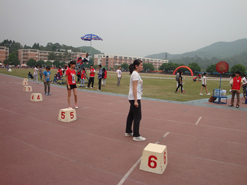 女子员工组三级跳远决赛正在上演,参赛的是来自1204班的庞阿丹和1203班的李富丽同学。比赛开始一声令下,庞阿丹同学三步跳跃,稳稳地落到了沙池里,取得了8.20米的成绩。