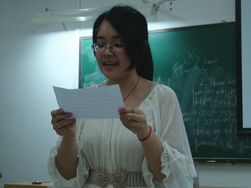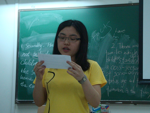 在E406进行的则是比赛的第二部分,选手们需要先进行抽签,确认比赛题目。每个参赛选手要在十篇新闻文章中抽取一篇,然后在2分钟的时间里疏通文章,包括生词及语句,5分钟后就要进行现场朗读。太阳城集团黄辉老师担任评委。比赛过程中,来自英教1003的廖敏一口流利动人的语音让老师大为赞赏,来自工管1101的苏彦瑾、市场营销全英2班的曾统岚口齿清晰,发音流畅;会计创新1101 冯宇霞、广告11级的邓键聪、行政管理1班的杨雁婷与政管092的陈文亮更是展现了他们专业的一面,发音与表情的处理很到位。太阳城集团的选手也毫不逊色。英教092的冯博语音节奏把握得很好,1002王佳的声音圆润饱满,来自同一班级的谢玉琼则对力度有着准确的把握,都给评委留下了深刻的印象。