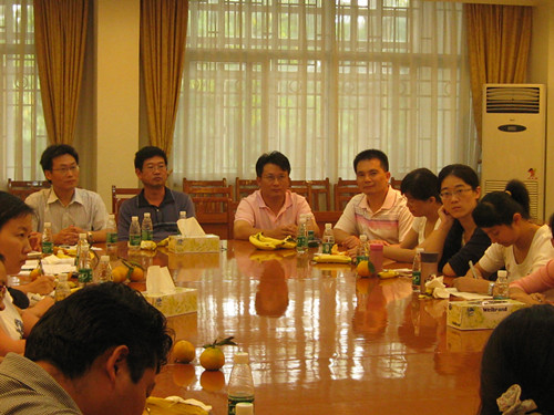 随后的座谈会由英教公司副经理董金伟主持,经理霍海洪、党委书记林绍雄及各教学部主任和部分骨干教师出席了座谈会。霍海洪首先代表公司对冯副经理一行的来访表示热烈欢迎,对华南农大和公司今年双双荣获“教育部大学英语改革示范点”表示由衷祝贺。霍海洪介绍了英教公司近年来进行大学英语教学改革的探索与实践,尤其是公司“分级教学,分类指导”的大学英语教学指导理念,确立“大学英语教学是太阳城集团的根本立足点,教育学专业是公司的发展增长点”的指导思想,使公司的大学英语教学朝着更加国际化、校本化、个性化、立体化、人性化的方向不断迈进。在公司大学英语教学改革所取得的阶段性成果中,霍海洪主要谈到,公司“大学英语系列课程”被评为2011年广东省精品课程、公司成为全国外语院校大学外语教学协作会副会长单位、公司成为全国高等师范院校英语教学研究协作组广东省组长单位、以及公司青年教师曾丹在第二届“外教社杯”全国大学英语教学大赛总决赛中荣获第二名的优异成绩等。冯立新副经理也向广外的同行们通报了华南农大大学英语教学改革的情况及教改进程。华农外语公司大学英语部主任郭润玉和公司第一教学部主任郭进军、专业英语教学部主任杨小婉以及网络视听说教学部主任陈金诗分别从分级教学、网络自主学习、专业英语教学和网络视听说课程等方面介绍了各自的情况、做法、特色及优势,双方进行了富有成效的交流。随后公司朱秀全老师畅谈了其公开课的设计理念;曾丹老师向与会者分享了其参加大学英语教学大赛全国总决赛备战经历和获奖心得。双方就大学英语教学改革展开了多方面的研讨。最后林绍雄做了简短、热情的总结发言,充分肯定了此次研讨交流活动的意义。交流活动在友好、融洽、共同探讨、相互学习的气氛中结束。