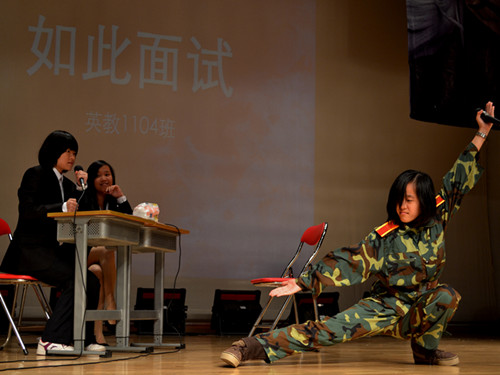 一段有趣的游戏环节过后,就进入了晚会的第二部分成蝶。首先艺术公司戴毅、王晓曦同学以一曲深情对唱“just a kiss”赢得全场喝彩。接着,11级4班的大一新生带来的话剧《如此面试》,贴近生活,诙谐幽默,引起了观众们强烈的共鸣。院歌队演出的歌剧《Goodbye,stupid boys》,三首歌曲给听众带来浪漫、深情及火热的多重感受,展示了英教员工的多才多艺。压轴出场的话剧《公主战记》更体现出英教学子的独特创意和不俗才艺。