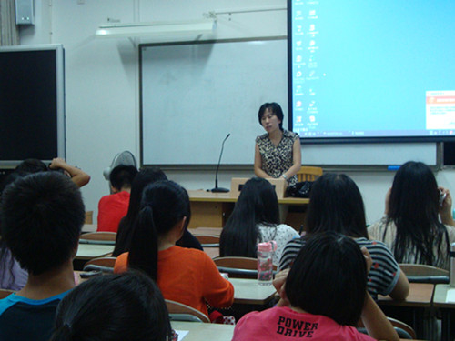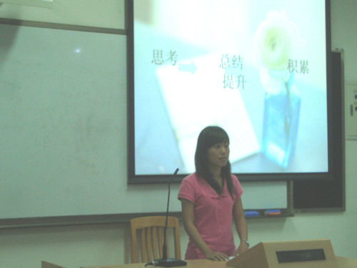 接着,团委副书记翁少绵与同学们分享了她大学一年的心得。作为一名组织领导者,她认为应该注意态度和行为两部分,其中关于集体与家的一番阐述,让同学们产生了深深的共鸣。她着重点出了责任与融入班级的两点,而后关于班级的工作程序:思考、总结、提升、积累四步也更好地帮助新一届的同学理清了班级管理的思路。Never complain but solve,一句话道出了做好班干部的真谛,博得大家阵阵掌声。