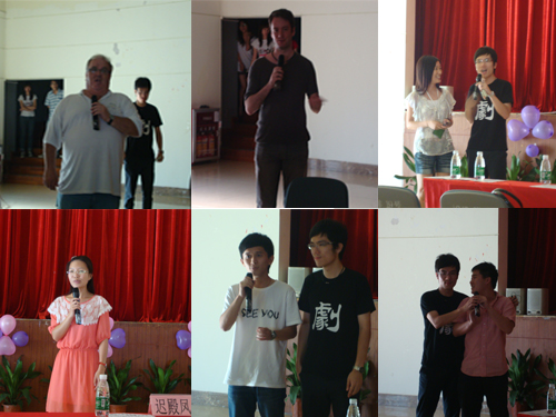 三个主题间还穿插有互动环节。英语绕口令和歌曲大反串邀请不同级的同学同台PK,台上台下一片欢声笑语。最后一个互动环节是我们的真心话,在073班同学陈境洋的主持下,07级各班都纷纷派代表说出自己的心声。他们回首过去四年的努力与拼搏,热情赞颂了同学间的真挚友谊和老师所给予的无私帮助。现场真情涌动,气氛感人。公司外教Dr. EdNicholson和Quinn Nicholson也登台祝福07级毕业生。他们称赞07级是很特别、很聪敏的一届,十分享受与他们一起度过的课堂,并用“yes we can”的口号热情鼓励07级毕业生在以后的人生中实现自己的梦想与追求。