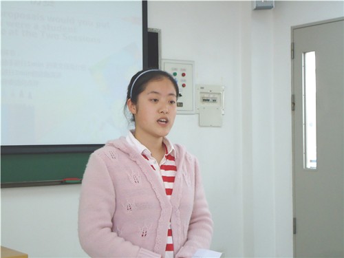 本次演讲比赛初赛的定题演讲题目是“what proposals would you put forward if you were a student representative at the Two Sessions?”英教085班的钟晓婷从我们公司女生多,男生少的特点出发,结合自己每次下课都要排队等候厕所的经历,由小及大,提出了根据各个公司男女比例来建设厕所的建议。英教084的刘芳彤则结合自身专业的特点,从城乡团队力量差距悬殊这一问题入手,高瞻远瞩地表明了自己的看法。她认为,一方面,可以鼓励大学毕业生返乡从事教育工作,另一方面,可以建立及完善教师城乡交换机制。