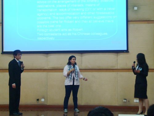 介绍完自己的队伍就进入了情景对话,这一部分吸引人的恐怕是外籍嘉宾Daniel和Sarah的搞怪客串了。不只是太“入戏”,还是他们俩故意“刁难”,对话中不时发生让选手“无言以对”的情况,小插曲不断。Sarah扮演的外国职工遭遇感情危机,两名中国员工前去劝导,Sarah不断用手挠脸颊,表现出愁苦的样子,把我们带到一个近乎真实的情景中。Daniel扮演各种角色时走“耍宝”、“装糊涂”的路线,这也为难了许多选手。在即兴对话环节中,我们分别抽到了“H1N1预防”和“五一旅游策划”两个预设话题。在陈文辉师兄讲到H1N1的症状与普通流感不同时,不料Sarah突然反问一句“How do I know?”,这时桂卿师姐接上了Sarah的问题,绕过了险些出现的尴尬局面。这段有惊无险的小插曲体现了队员的默契配合和高超的随机应变能力,令人佩服。
