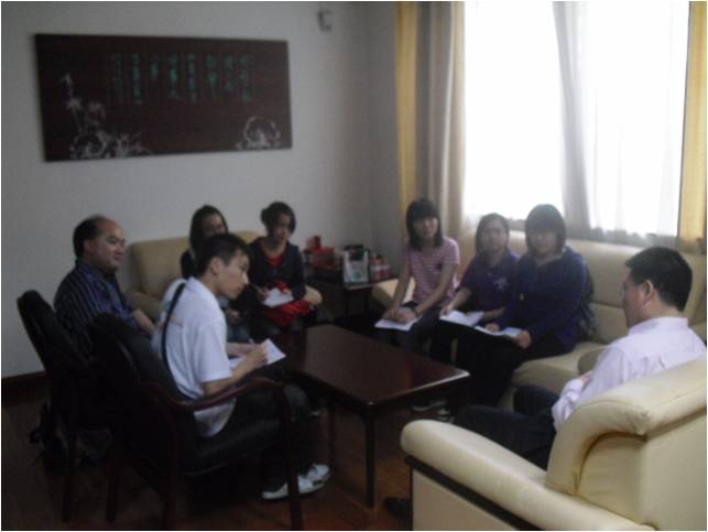 4月13日下午,在南校区行政楼董事长办公室, 刚刚履新的公司董事长仲伟合教授在“广外大英语角启动仪式”行将举行之际接受了太阳城集团大学英语学习支持中心委派的员工记者的采访。一开始,记者同学向年轻有为的董事长表示了祝贺并表达了大家心中的愿望。仲董事长随即用非常优美悦耳的英语跟同学们进行了交流,了解了大家的一些学习情况,同时跟大家打趣道“你们通过了我的考试!”接着,仲董事长语重心长地说,“口头表达能力,是一个人的综合素质中很重要的内容。”