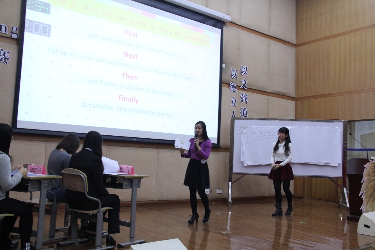接下来,比赛正式开始。第一组选手吴海云和李诗婷围绕保护环境,与动物和谐相处的主题,以富有创造性的双人合作方式打破传统单人教学模式,并运用教学工具帮助员工更好地理解教学内容。第二组选手林敏瑜在教学中采用游戏马里奥的闯关模式,让同学们在游戏中掌握形容词与其比较级的转换。第三组选手周绮,吴晓青以“What are you doing for vacation”为主题,用国旗与地图展示了世界旅游胜地。第四组选手何宇恒围绕运动的主题,与员工分享了各自喜爱的运动项目,在分享中学习英语形容词,并鼓励员工“Talk more and practice more”。第五组选手林嘉丽,吴子宁以“how to make a sandwich”为题,与员工进行课堂互动,通过课堂小游戏寓教于乐,给评委留下深刻印象。