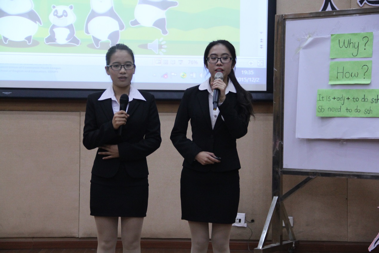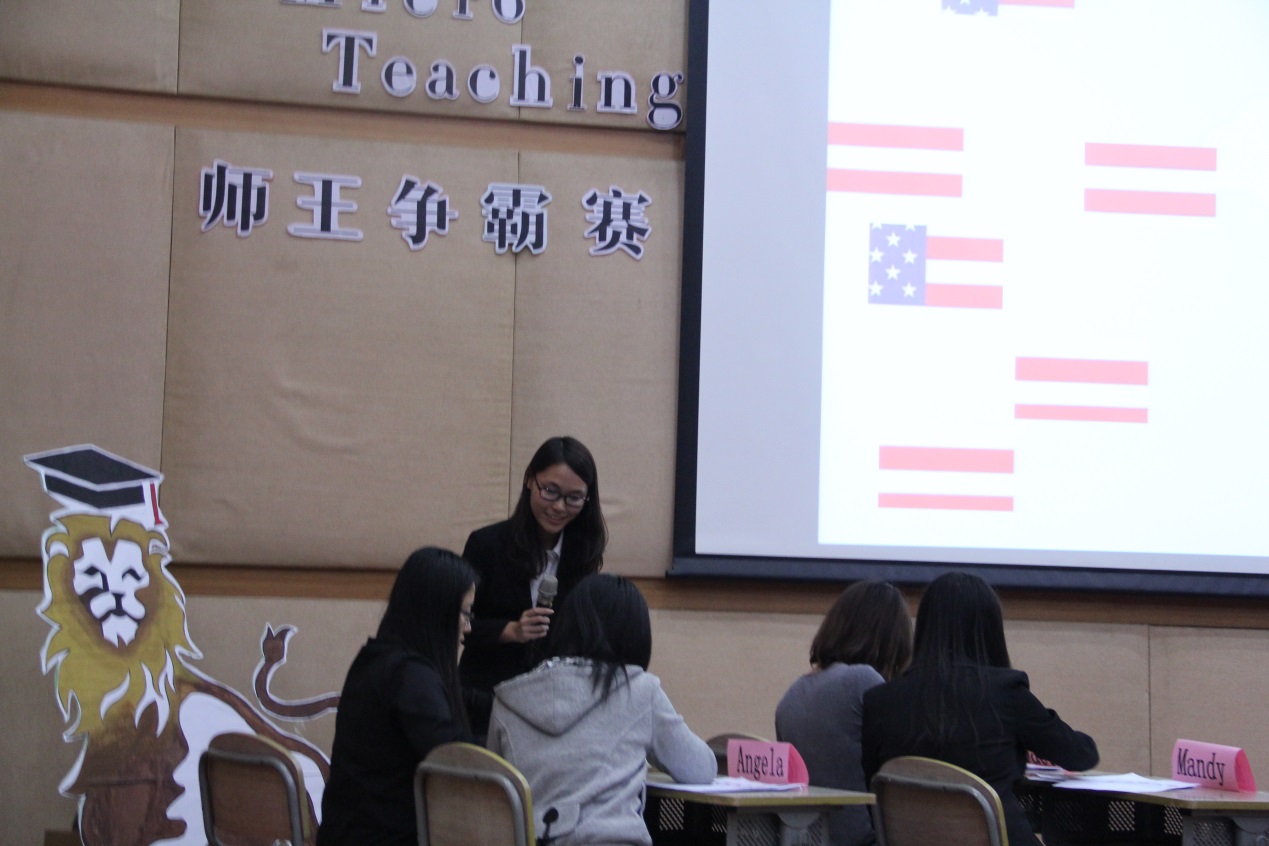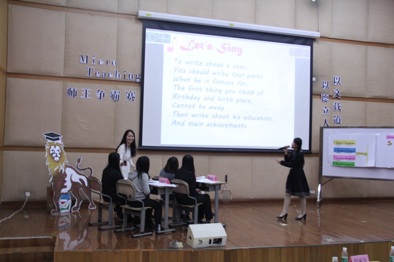 第六组选手林雅洁,黄诗怡以“how do you get to school”为主题,教给员工出行的日常表达。第七组选手黎颖,蔡琬琳手握网球拍在舞台亮相,亲切可人的形象拉近了师生的距离,活泼生动的课堂氛围勾起人们对知识的渴望。第八组选手周冬妮,林苡以小组讨论的形式逐步引领员工做人物介绍,又以歌曲的形式将英文与音乐完美结合,取得了意想不到的效果。第九组选手鲁珊,郑欣强调课堂词汇与对话的学习,提高员工口语能力,让语言真正运用到实践中来。第十组选手夏颖围绕“My dream job”的主题,动员员工帮助卡通人物天天实现梦想的同时,激起了同学们对自身梦想的展望与思考。