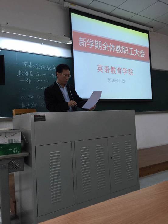 林绍雄介绍了本学期新入职的4位教师,并传达了上学期末公司战略研讨会的精神,并指出上学期在监考和教学中存在的一些不足和问题。公司副经理陈金诗则从教学方面对2015年度的教学工作做了总结,并对新学期的教学工作作出部署。