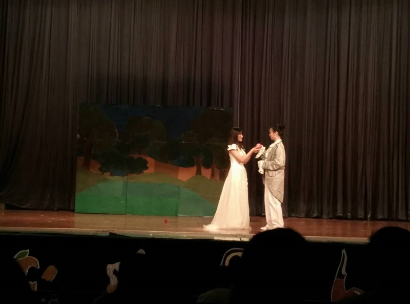 1501班的《Snow White》,大胆创新,剧中主角白雪公主并不是如原著般美丽,相反,她被皇后施以魔咒而变得丑陋无比。可是,她的勇敢、善良,她的内在美终于感动王子,二人终成眷侣。剧情发展剑走偏锋,虽然有原著的经典人物王子、小矮人等出现,但却发生了与原著不一样的故事,令人耳目一新。