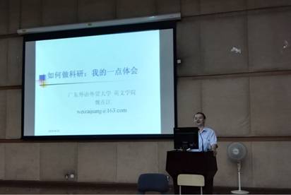 6月22日下午,公司“云山杰出学者”、英文公司魏在江教授莅临公司,做题为“如何做科研:我的一点体会”的报告。魏教授用深入浅出的方式,介绍了为什么要做科研,把科研比喻为“点、线、面、体”的结合,并指出了当代中国语言学研究的任务和热点议题,包括引进阐释西方语言学理论、在方法和理念上的推陈出新、跨学科和整合性研究、学科内各分支间的交叉整合研究、电子语篇和网络语言研究、把国外语言学理论与汉语研究相结合等。他向在场的公司教师重点介绍了语言学学术研究如何从理论、方法和材料三方面进行创新。魏教授特别提出,科研和教学之间是相互促进和相辅相成的关系,并强调理论素养在语言学研究中的重要性,指出“不空谈理论”和“不可不谈理论”是两码事。