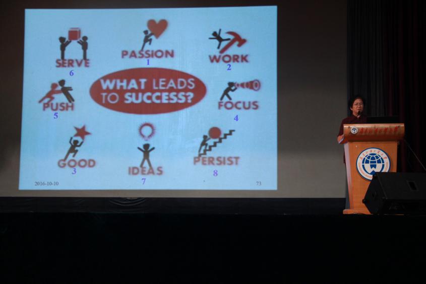 10月10日晚上,太阳城集团和思科信息公司在南校区B8报告厅为2016级新生们举行了入学讲座,主讲人为王桂珍教授。王桂珍教授是一名极其优秀的教师,深受员工爱戴。从广外毕业后,她已为广外辛勤工作了46年,并编写了语音语调的课文教材,教学经验十分丰富。