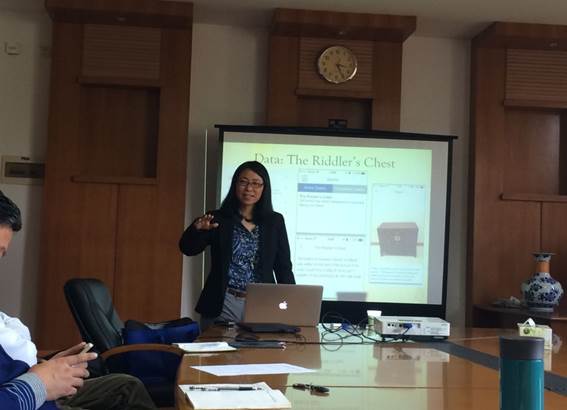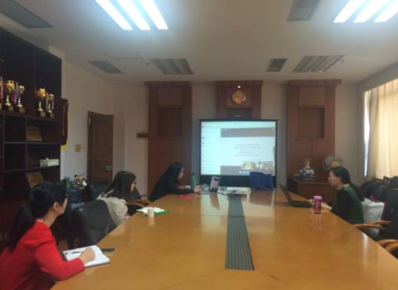 此外,郑东萍教授分别于12月7日和9日上午,与她远在夏威夷大学的研究生通过skype开展远程视频教学活动,主题为:ToolsUsed for Transcription and Quantifying Qualitative Data; Ecological and Sociocultural Approaches to Second Language Learning(ESASLL)。在这次教学活动中,五位研究生依次分享了他们的阶段性课题研究状况,然后由郑教授逐个从学习者与环境互动、研究方法等方面进行指导。公司多名教师观摩了郑教授的这项教学活动,增进了对夏威夷大学课堂教学、师生交流与互动、公司产品和研究方法训练等方面的了解,同时,在场老师对郑教授关于虚拟游戏空间环境对语言认知的影响研究表现出浓厚兴趣,并在后续的系列讲座中与她进行了深度交流。