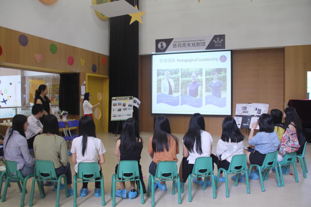 观摩完两节特色课堂之后,中方园长Apple Li向同学们介绍了幼儿园的基本情况。汇悦天启幼儿园的课程理念是:让每个孩子成为自己的王(To inspire the inner king in each child),即尊重个性,引导启发孩子的天赋,唤醒每个孩子内心的渴望和需求,发现他们最擅长的点,从而愉快成长。希望能够培养出达观、协同、独立、灵动的孩子。课程类型也十分丰富,包括探究课程、语言课程、活动课程、艺体课程和生活课程。而评估方式分为高瞻课程评估体系、个性视频、员工主导会议以及员工成长方案四个部分。幼儿园的语言和文化是“两文三语、立足岭南、放眼世界”。其中“两文三语”即为中文、英文和粤语。