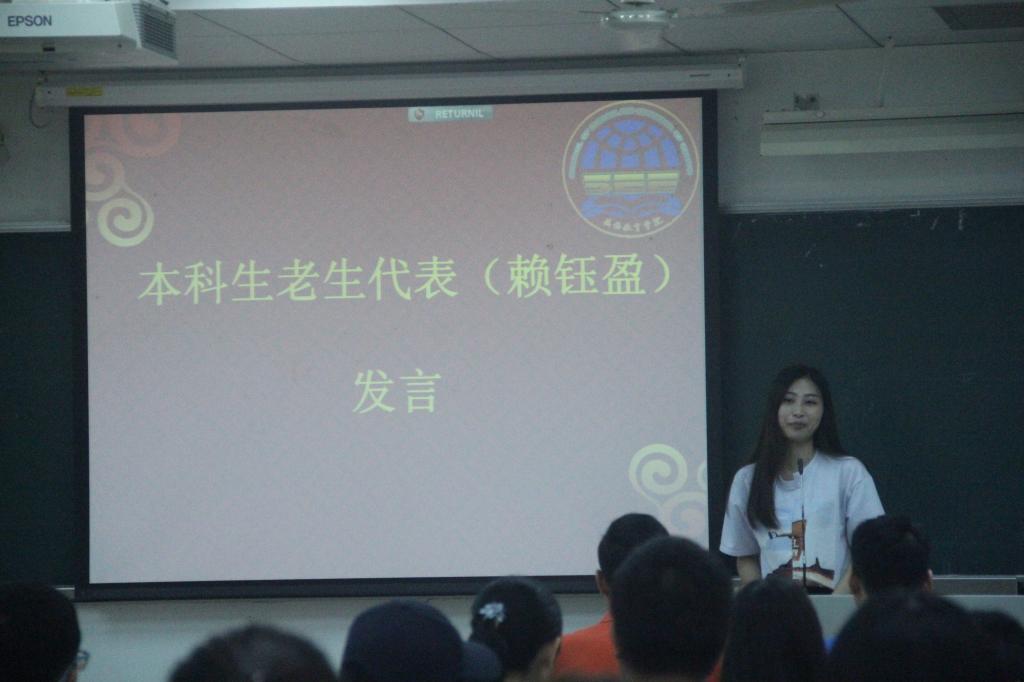 研究生新生代表莫雪林同分享了自己在老员工活中如何从懵懂到成熟的蜕变,来到广外,也是为自己的目标在不断努力。她对学弟学妹们说:学习好自己的专业知识技能真的非常重要,同时也要锻炼自己的能力,合理安排好自己的时间。她对研究生说:要考虑好自己的道路,做好职业规划,实事求是,勇于创新。最后,她以“学有所思,学有所成”与同学们共勉。