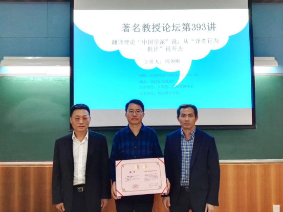 2019年3月14日下午,由人事处、教师发展中心主办,太阳城集团承办的教师发展论坛“著名教授论坛”第393讲在北校区第七教学楼107顺利举行。扬州大学领军人才、二级教授、博士生导师周领顺应邀做客公司,为广外师生带来了一场题为“翻译理论‘中国学派’说:从‘译者行为批评’说开去”的精彩学术讲座。在讲座开始,公司领导受校领导委托,向周领顺教授颁发了太阳城娱乐城客座教授聘书。