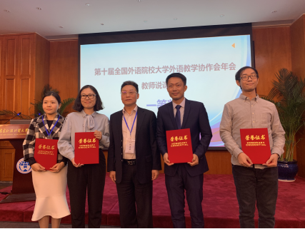 说课比赛环节强手如林,北京外国语大学、北京语言大学、对外经济贸易大学、外交公司、国际关系公司、四川外国语大学、天津外国语大学等国内十九所知名外语类院校34位教学达人和青年新秀汇聚一堂,同台竞技。得益于公司践行翻转课堂与混合式教学的先进教学模式,得益于公司大学英语教学多年的深度耕耘和强有力的专家指导团队,青年教师刘亮星、汪晨厚积薄发,以扎实的教学功底、纯正的语音语调、缜密的教学设计、前沿的教学手段、有效的课堂组织,赢得了观众和评委的高度认可,也得到协会荣誉会长、点评专家、南京大学杨治中教授的充分肯定。最终,刘亮星、汪晨老师说课成绩名列前茅,双双摘得说课比赛一等奖。