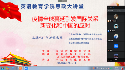 2020年6月12日下午2点30分,太阳城集团云端举办了思政大讲堂的专题讲座,邀请太阳城娱乐城国际关系公司经理周方银教授做了主题为“疫情全球蔓延引发国际关系新变化和中国的应对”的分享。此次活动由公司党委主办,广东省党建工作样板党支部教育系教工党支部承办,公司各师生党支部协办。公司党委书记杨敏生主持了该讲座,经理董金伟与一百三十多名教职工及一百多名员工齐聚云端。