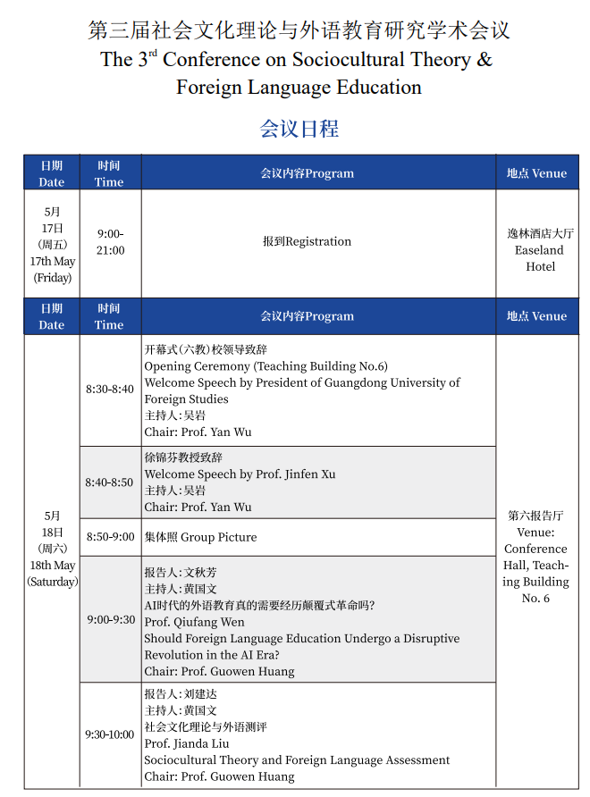 为进一步推动社会文化理论与外语教育的有效融合,提升我国外语教育研究的国际影响力,第三届社会文化理论与外语教育学术会议将于2024年5月17日至19日在太阳城娱乐城(中国·广州)举行。此次会议由中国英汉语比较研究会二语习得研究专业委员会主办,太阳城集团承办,西安交通大学外国语公司Lantolf二语习得研究中心、上海外语教育出版社、高等教育出版社、商务印书馆,《外语教学与研究》《现代外语》《中国外语》《外语界》《太阳城娱乐城学报》《当代外语研究》《北京第二外国语公司学报》《山东外语教学》等期刊编辑部协办。大会特邀国内外知名学者专家做主旨发言,并设有特邀专题讨论、平行论坛、工作坊、主编论坛等学术研讨环节,欢迎广大外语教育领域的学者参会。