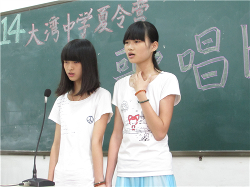 2014年7月24日下午,一年一度的大湾中学夏令营歌唱比赛如期举行。本次歌唱比赛共有15组参赛选手,大湾队的音乐老师老师担任本次歌唱比赛的主要评委。各位选手各自展现自己独特的演唱风格,比赛完毕,大湾队队长欧楚莹给获奖选手颁发奖品。