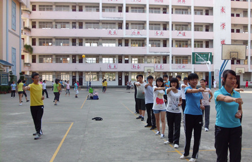 在课程安排上,广西“水粤侗天”服务队精心准备了阳光课堂的授课内容——除了气排球运动,还有由不同的老师教授的武术、太极和跆拳道课程。同学们可以根据自己的兴趣喜好进行选择。在这些课程中,基本上每位同学都找到了自己想上的课并跟着老师们认真地学习。此外,也有几位同学反映“希望可以学习舞蹈、吉他之类的活动”,听到这个愿望,几个老师聚集在一起,纷纷开始计划教同学们恰恰舞。
