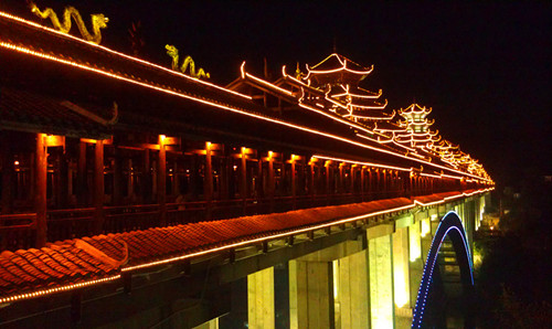从博物馆出来,且在月亮街草草晚饭之后,趁着月色,队员们游看三江风雨桥。这座新建的风雨桥,造型美观,具有观赏价值,且实用,为当地居民的出行带来了极大的便利。夜色下的风雨桥,彰显着这座小城独特的魅力,是三江夜晚独特的不可替代的一景。队员们深受此桥吸引,登桥一睹为快相机镜头闪出的亮光此起彼伏。