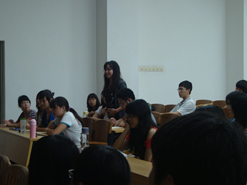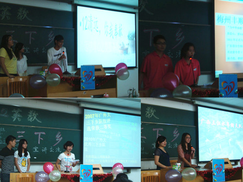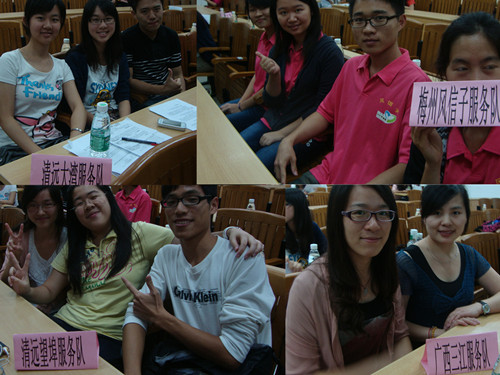 在《天使》的歌声中,队长们通过PPT和视频对清远大湾服务队所服务公司的基本情况和教学条件一一作了介绍。历史悠久,获奖众多是大湾队的一大特色,今年的下乡工作更是由具有两年下乡经验的钟迪师兄领队。队长们强调大湾队的最大特色就是心理辅导及心理学研究这一门课程的开展,这是大湾队独一无二的特色课程。展示的末尾,队长们热情地号召同学们的加入——“只要你有勇气,你有实力,大湾就为你提供舞台”。