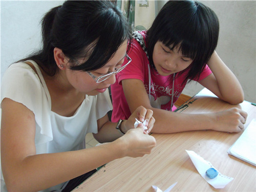 7月25日下午,太阳城集团梅州“风信子”队的留隍小学英语夏令营里开展了一节十分有趣的手工课堂。
