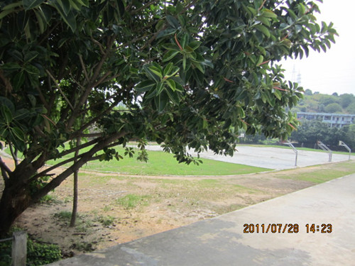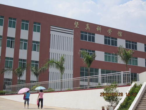 这是校园内最先进的多媒体教学区。七月的阳光投射在这科学馆的金色的名字上,“坚真”二字仿佛向来宾柔声道出该校师生的精神与态度——坚强不息、求真务实。参加培训的教师们不畏酷暑,那一把把淡雅的小阳伞和一个个坚毅前行的身影,构成了这盛夏的校园里的一道醉人的风景线。