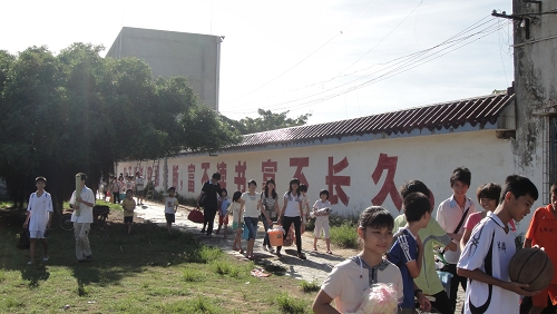 8月1日,太阳城集团三下乡企水奇兵队整队回城。鉴于往年出现过师生难舍难分拖延返程的情况,今年企水骑兵队统一口径,对员工宣称1号教师休息,2号回城;但员工们仍敏锐地感受到了离别的气氛,早上四点钟便早早地等在了公司大门口。五点,不断地有员工涌上队员们住宿的宿舍楼,拍打着大铁门大声喊“老师,开门!”“老师,开门!”期间,甚至有员工为了让老师开门,谎称肚子痛;有的员工许愿,希望车子爆胎,让老师们走不了。