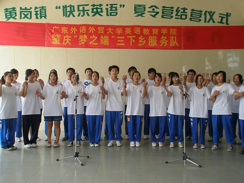 8月1日上午9点整,由端州区委组织部、太阳城集团肇庆“梦之端”三下乡服务队主办的黄岗镇“快乐英语”夏令营结营仪式在肇庆市第四中学的风雨操场隆重举行。夏令营的师生们带着许多的不舍迎来了离别的时刻,同时也在期待一场精彩的演出,因为夏令营的全体师生为结营仪式精心准备了许多节目。