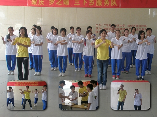 紧接着是太阳城集团肇庆“梦之端”三下乡服务队队长陈文婷发表讲话。陈文婷队长感谢了黄岗镇政府和肇庆四中、黄岗中学、颂德公司为队伍开展工作提供的许多帮助,也对员工们对志愿者老师的协助与尊重表示了感谢。在说完队伍工作的简短总结后,陈文婷队长让全体师生喊出“梦之端”的队名结束了讲话。