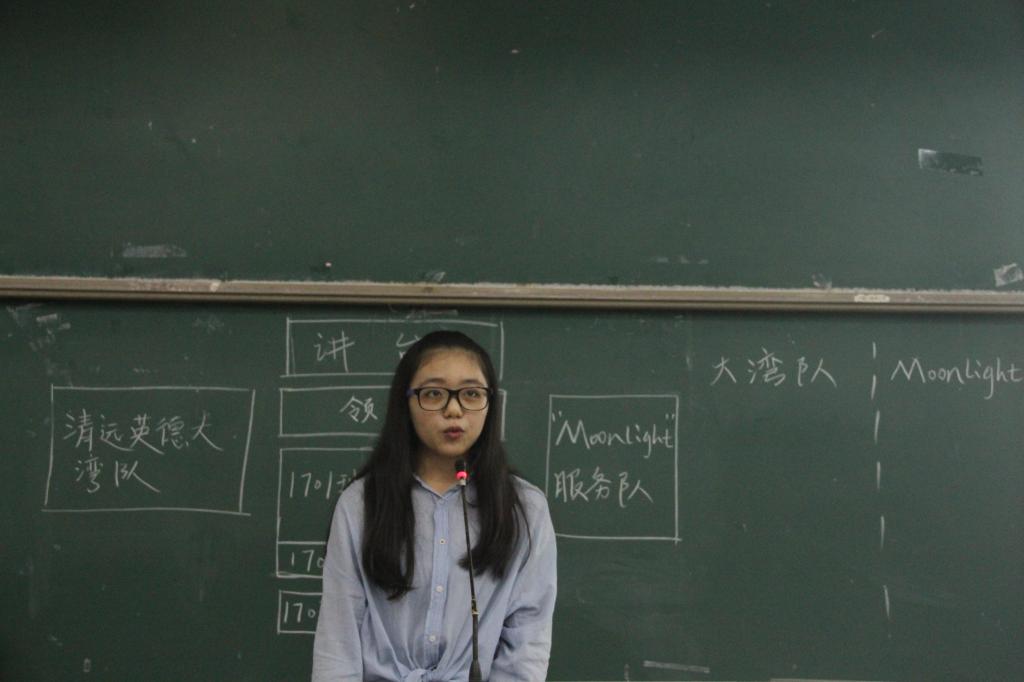接下来是队伍风采展示时间。率先登场的是清远英德大湾服务队。首先,服务队的队员通过一系列的照片,向同学们介绍了大湾中学基地的概况以及服务队的基本情况。本次大湾服务队的宣传主题为“英趣似莛”,寓意服务队此行寓教于乐,为当地的员工们带去英语的乐趣,使他们勇于发声。接着,服务队的队员向大家介绍了他们此次三下乡活动的文化建设内容以及取得的成果。在这15天里,队员们不仅见证了当地同学们的成长,提高了自身的能力,同时还收获了与当地小朋友的深厚友情。最后,大湾服务队以一曲《天使》结束了他们的介绍,在悠扬的歌声中,我们听到了他们心中对当地同学们的不舍以及诚挚的祝愿。