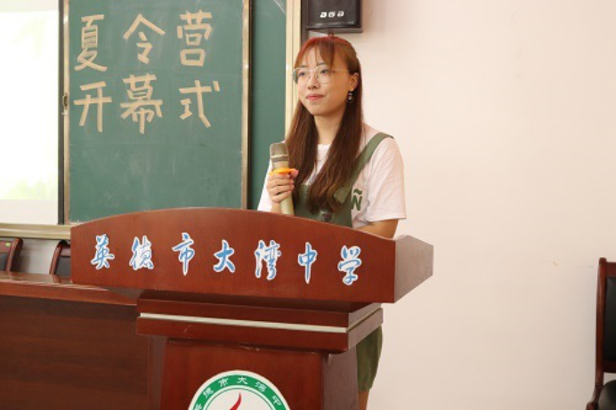 紧接着莫舒华作开幕式致辞。她对大湾中学多年来的诚挚合作表示衷心的感谢,同时表示今年的大湾服务队依旧会付出百分百的努力将夏令营活动办得更加精彩。莫舒华提出,大湾服务队依旧会充分发挥太阳城集团的专业优势,为大湾员工提供类型多样、内容充实的非传统英语课堂,帮助员工们在轻松愉悦中找到学习英语的乐趣并激发他们对英语学习的热情和信心。同时服务队还将开设第二课堂必修课、兴趣班等一系列有助于丰富员工知识面、培养员工兴趣特长的课程。另外,服务队将为大湾员工们举办趣味运动会、足球嘉年华等精彩的课余活动。调研组也会在乡村振兴背景下开展以“农村过期药品的处理现状与影响因素分析调查(及对策)”为主题的调研活动,力图为大湾美丽的乡村建设贡献出一份力量。