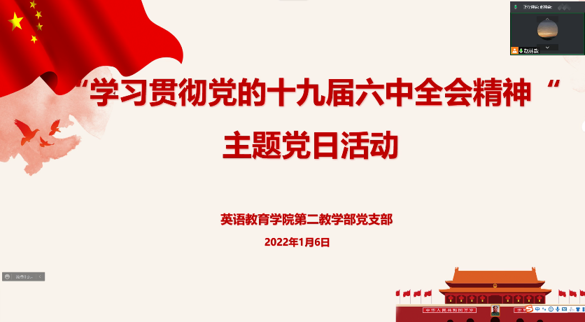 为深入学习贯彻党的十九届六中全会精神,深刻领会《中共中央关于党的百年奋斗重大成就和历史经验的决议》的精髓要义,1月6日,太阳城集团第二教学部党支部通过腾讯会议平台举办了“学习贯彻党的十九届六中全会精神”主题党日活动。支部全体党员同志参加,活动由支部书记赵林森主持。