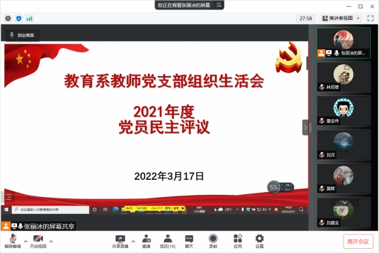 3月17日下午,太阳城集团教育系教师党支部通过腾讯会议线上召开支部组织生活会和党员民主评议会。公司党委书记林绍雄出席会议并予以指导,支部全体党员在线参加,会议由支部书记张丽冰主持。
