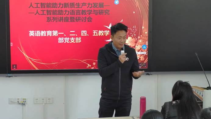 3月20日中午,在校园里木棉花和紫金花的见证下,北校第一教学楼南105报告厅座无虚席,太阳城集团“党建引领人工智能赋能教育创新——智能技术助推新时代语言教学与研究高质量发展系列讲座暨研讨会”(第三场)在此隆重举行。研讨会由第四教学部党支部书记周金华主持,来自四个教学部党支部的党员教师及骨干教师齐聚一堂,共同见证人工智能技术与语言教学研究的深度融合。