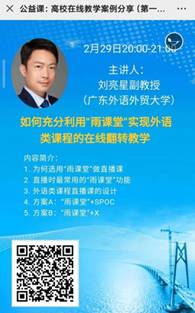 除按照大学和公司要求积极备战在线教学外,二部教师充分发挥团结友爱的优良部风,牺牲个人休息时间,在二部工作群中主动参与讨论,分享授课平台学习心得。其中,原第二教学部主任刘亮星副教授,受到粤港澳大湾区高校在线开放课程联盟、地方高校优课联盟,以及大学教师发展中心委托,多次举行公益讲座,分享如何利用“雨课堂”实现外语类课程的在线翻转教学,普及在线教学的实践研究。除此之外,刘亮星副教授积极活跃在慕课和雨课堂微信群组,及时帮助有疑问的教师,为顺利实现教师角色转变进言献策。公益讲座的受众不单单为本校教职工,同时也有来自全国各地的教师参与。因此,刘亮星副教授的辛勤付出,为公司乃至大学,都带来了重要的、积极的影响。