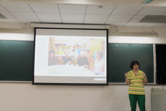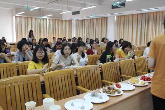李海丽老师为同学们准备了许多水果、甜点等,让讲座在轻松愉快的气氛下进行。她从自身出发,向大家讲述了她的人生经历。从作为第一批“小老员工”迈进广外校园,到后来只身远赴加拿大求学,再到回国后投入到交际英语的教材编写工作,李海丽一直抓住机遇,努力学习,认真工作。在讲述关于公司交际英语教材编写经历时,她提到,当时主持交际英语教材编写工作的李筱菊教授和桂诗春教授身上敢于创新、淡泊名利等品质值得我们学习。