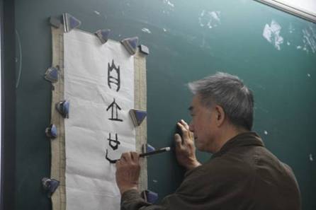 在介绍完“斜体行书”后,陈金诗又为同学们介绍了英文书法中的“花体字”。花体字是一种艺术性很高的字体,同时也非常的复杂。陈金诗鼓励同学们多尝试一些新的字体,多加练习,坚持不懈,一定能在英文书法上取得一定的成就。为了帮助同学们克服对新鲜事物的恐惧,陈金诗邀请同学们在黑板和宣纸上进行练习。同学们纷纷上前拿起毛笔和粉笔进行模仿,虽然功夫还远不到家,但兴趣的种子已经埋在了心中。陈金诗在一旁鼓励、指导着同学们,现场的气氛非常轻松活跃。
